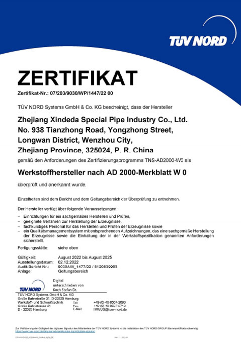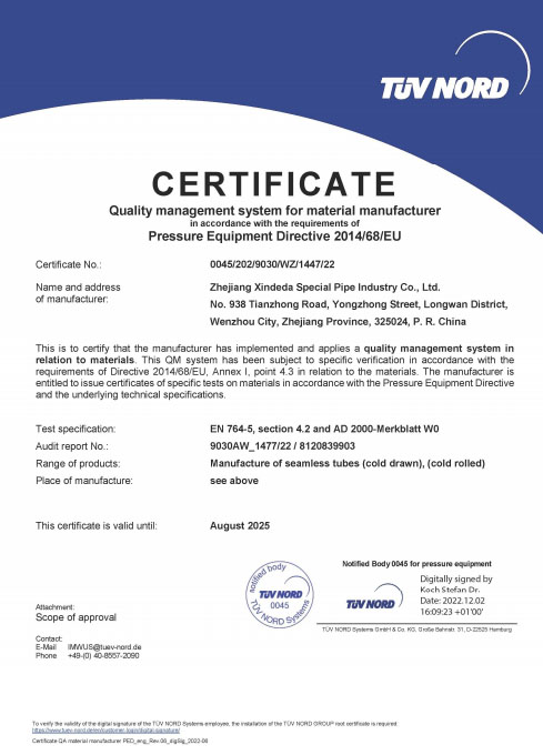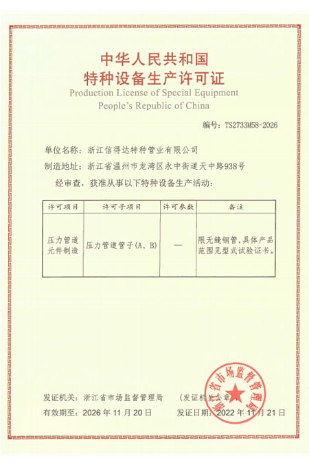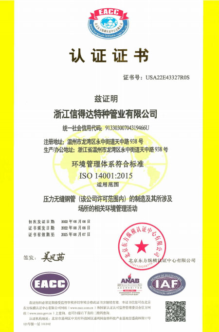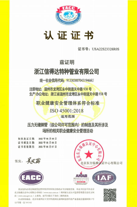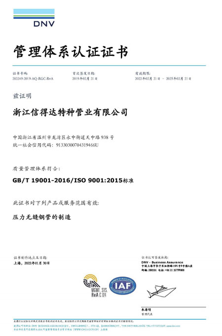 公司嚴格按ISO9001:2015《質量管理體系—要求》、ISO14001:2015《環境管理體系 要求及使用指南》、ISO 45001:2018《職業健康管理體系 要求及使用指南》和TSG 07—2019《特種設備生產和充裝單位許可規則》,建立完善的管理體系。公司擁有國內較大的12000KN冷拔機組和先進的全溫控不銹鋼固溶退火爐等生產設備,同時具有ET16-159渦流探傷儀、UT16-159超聲波探傷儀、UT159-830超聲波探傷儀、H159-630水壓試驗機、WAD—600液壓材料試驗機、4XB電腦金相顯微鏡、JQ—300沖擊試驗機、HBRVU—187.5硬度計、島津光譜儀、化學分析儀、晶間腐蝕試驗等完善的檢測設備。